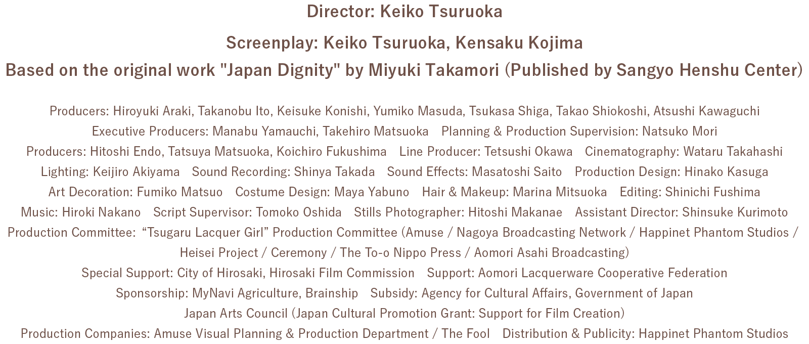 The film is directed by Keiko Tsurusaka, whose feature debut Town of Whales received acclaim at the Berlin and Busan International Film Festivals, and who also adapted Kanae Nishii's novel Makuko for the screen. With richly depicted seasonal landscapes, locally rooted cuisine, and the quiet charm of the people, the film paints a portrait of a father and daughter who, like layers of lacquer built up over time, deepen their bond through the spirit of urushi.