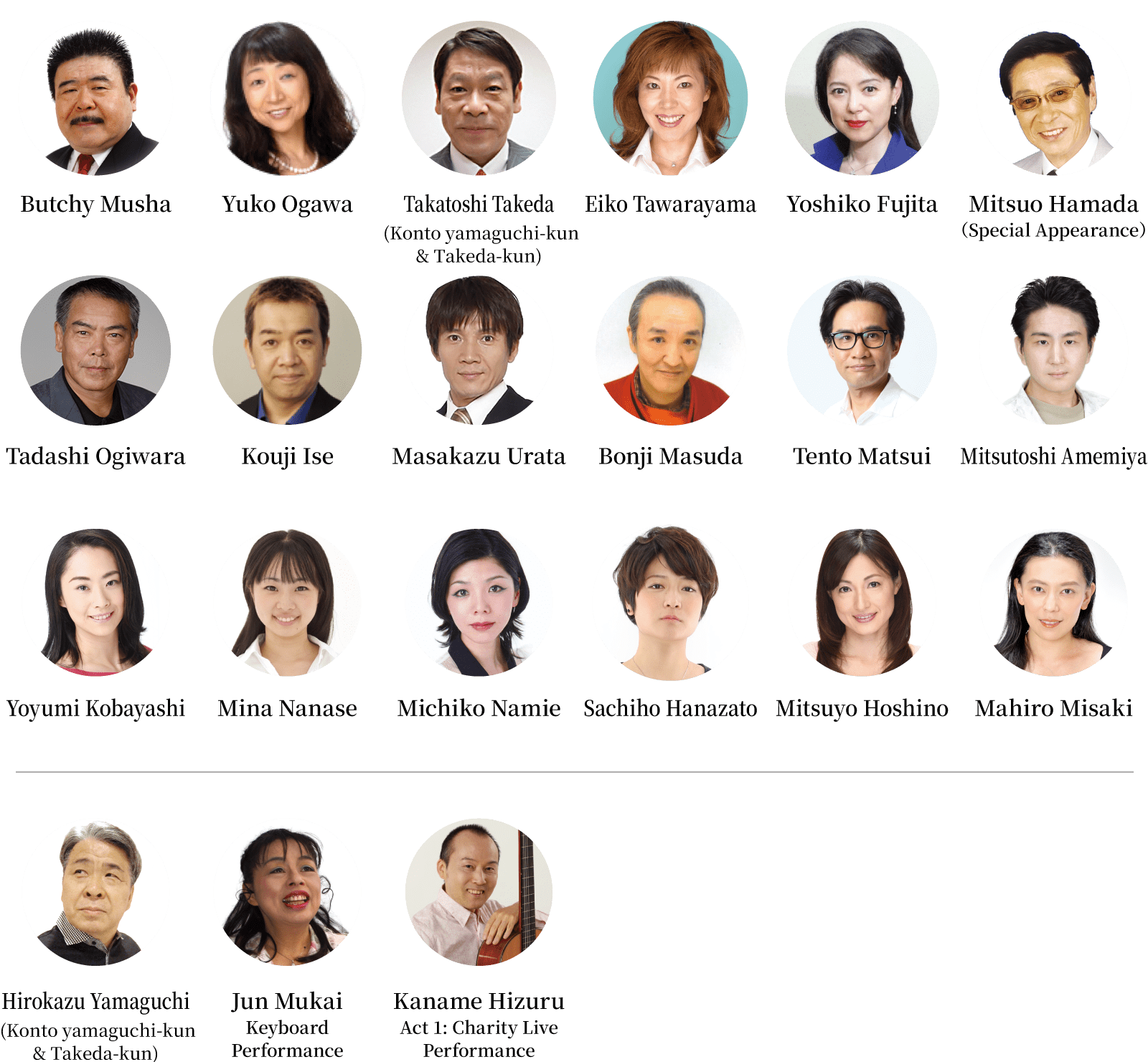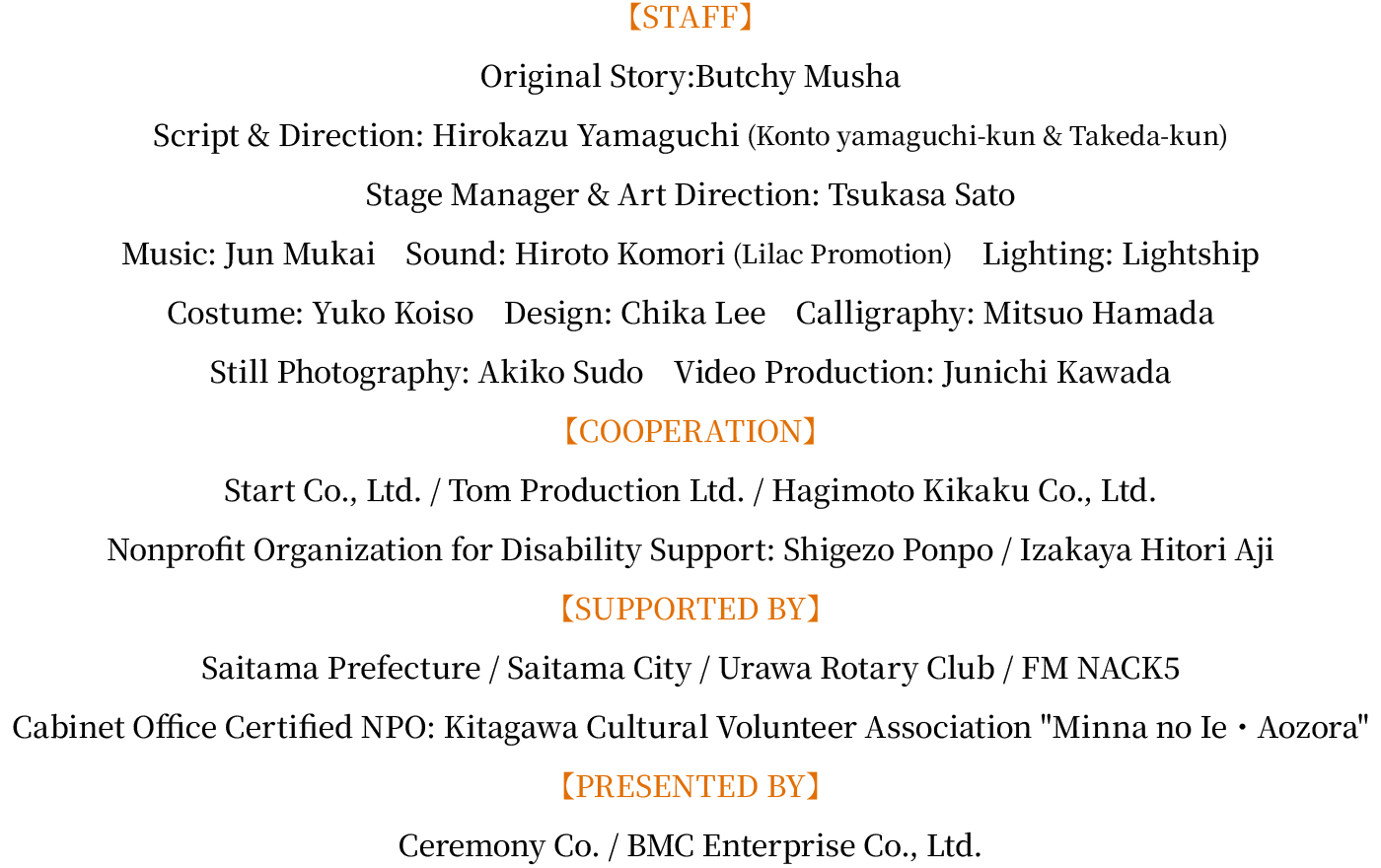 Butchy Musha, head of the theater troupe, rose to fame in the 1980s as the iconic “God of Repentance” on the hit variety show Oretachi Hyokin-zoku (Fuji TV), especially in its hugely popular segment, Hyokin Zange-shitsu (“The Repentance Room”). In 2014, he founded Gekidan ZANGE (Theater Company ZANGE) to stage the play Ikiru ("To Live"). The company made its debut with a successful run from September 2 to 7, 2014 at the Haiyuza Theater in Tokyo. As of 2017, the troupe has performed in a total of 14 locations across Japan. The script and direction are by Hirokazu Yamaguchi, known both for his comedic duo Kont Yamaguchi-kun to Takeda-kun and for his work as a playwright. Adding prestige to the production is a special guest appearance by Mitsuo Hamada, a major star of Nikkatsu’s “pure love” films of the 1960s, who rose to prominence alongside Sayuri Yoshinaga on the silver screen.