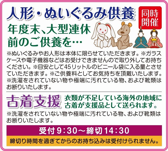 ご家庭で大切にされていたお人形やぬいぐるみを心を込めて供養いたします。