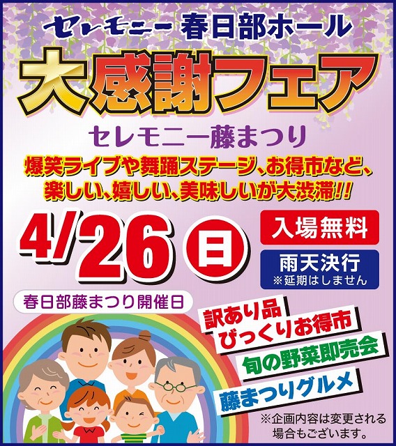 春日部藤まつり開催日に合わせ、セレモニー春日部ホールにてフェアを開催します。