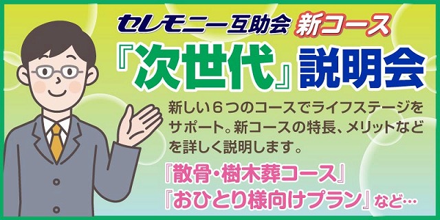 今回は通常の相談会に加え、時代のニーズに合わせた互助会新コース「次世代」の説明会も実施いたします。